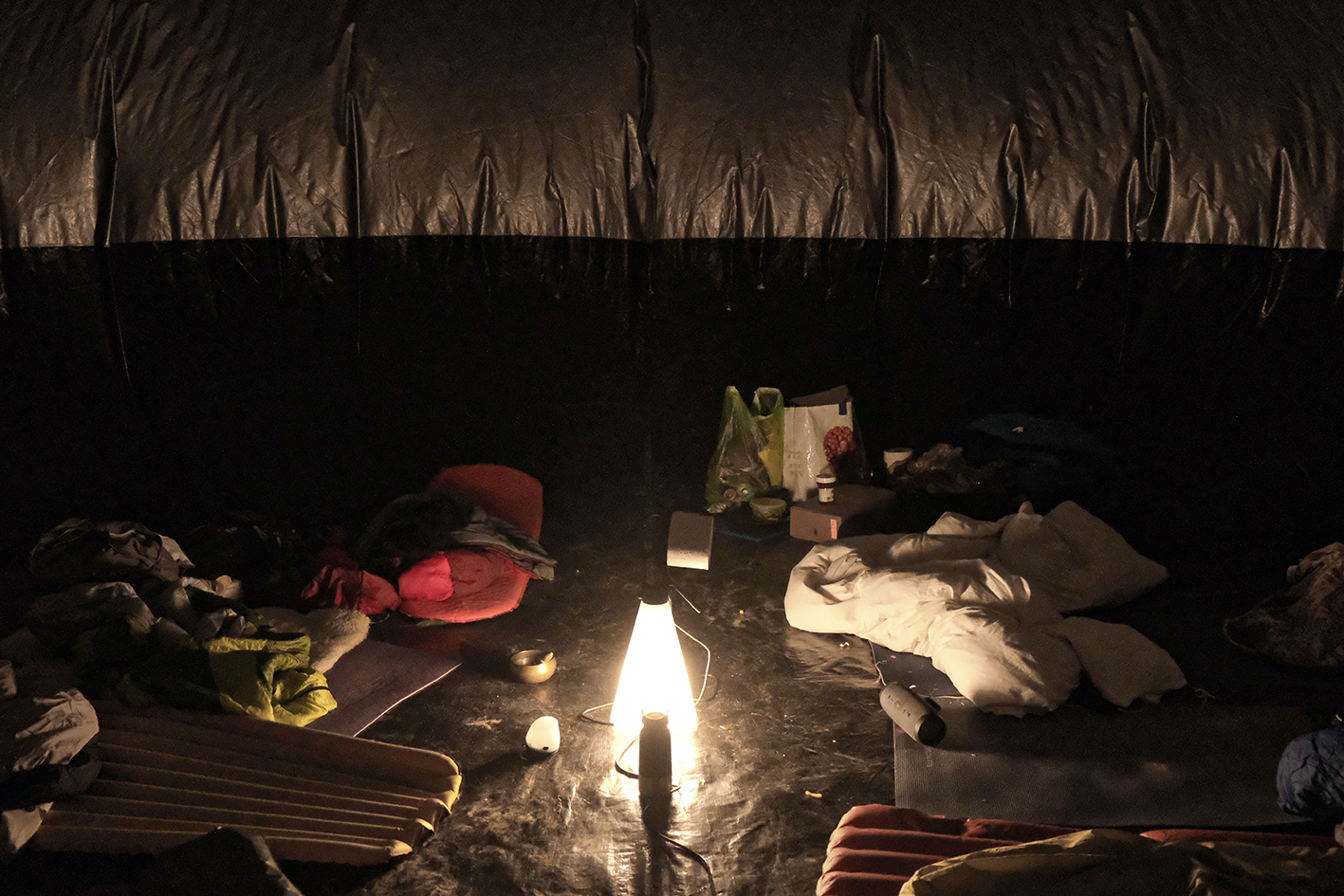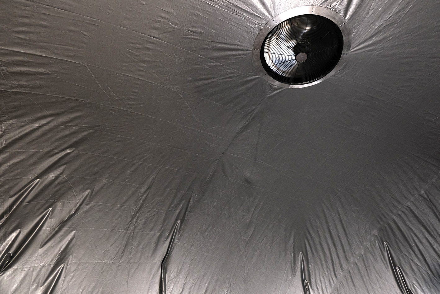 Two circles of technical fabric sewn together and inflated create a dark and mysterious space.