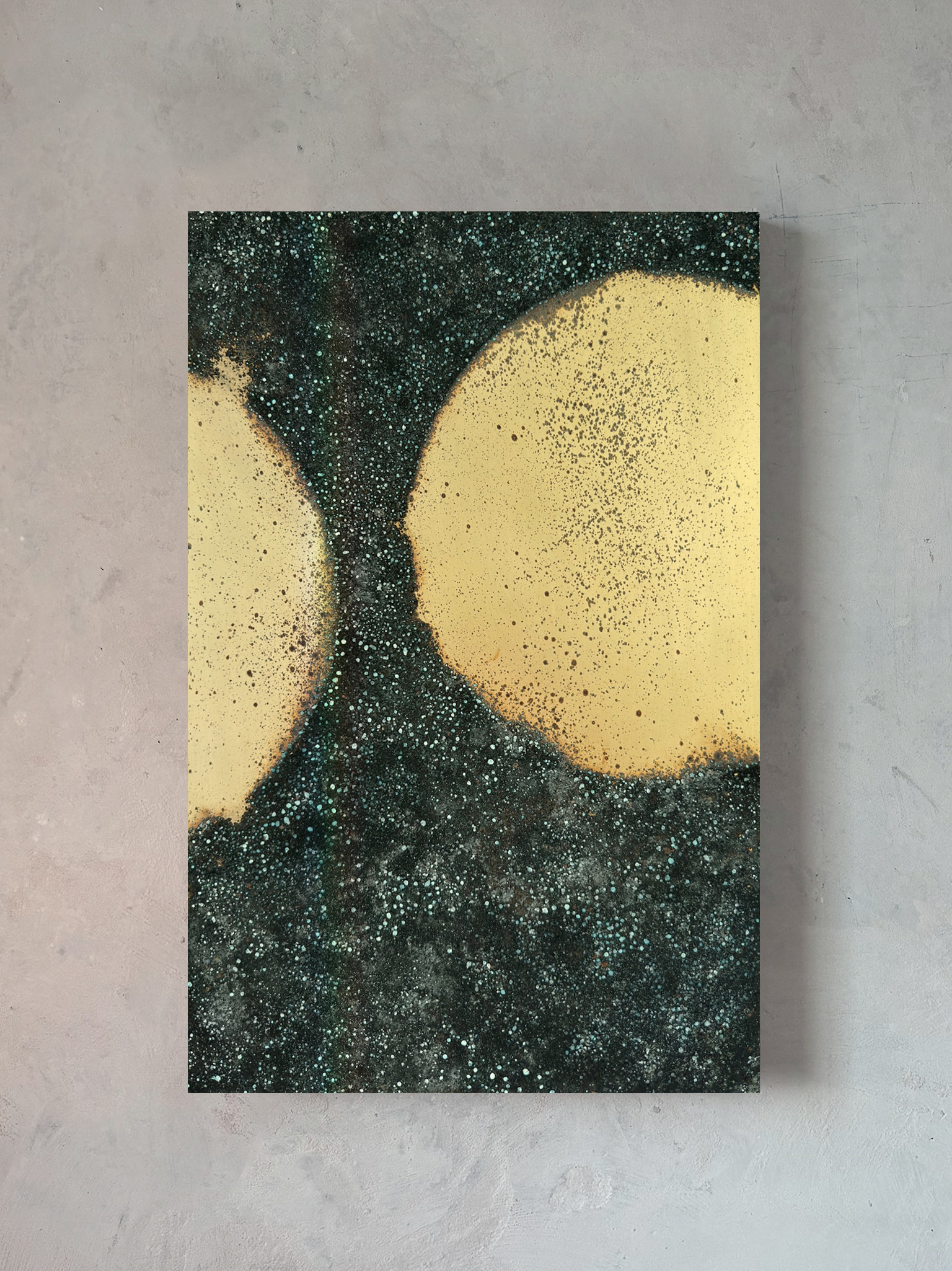 /Crossover. Quema de pólvora sobre bronce-latón. 40x60 cmExtracto del texto „Sures“ de Franciasca Urritua Miranda/
